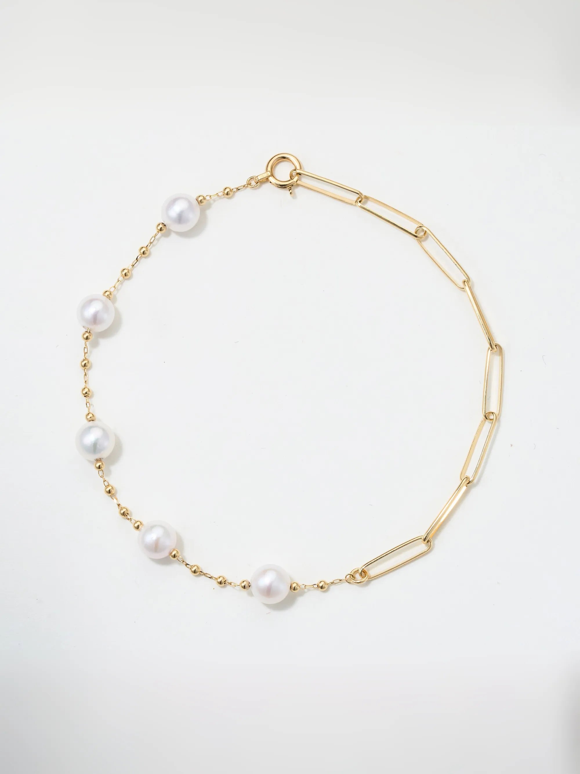 This modern-meets-classic bracelet combines elongated paperclip links on one side with lustrous pearl stations and tiny gold bead accents on the other for an intentionally off-balance, fashion-forward look.