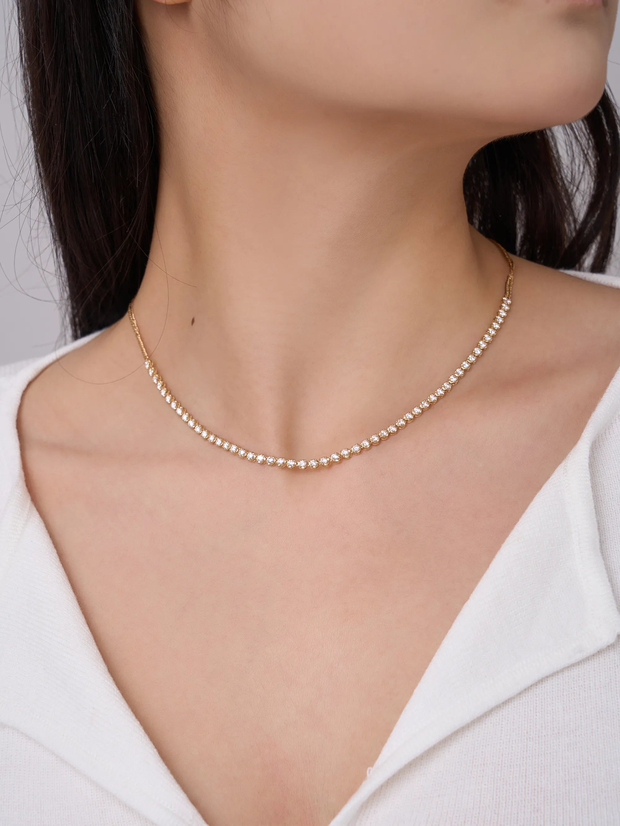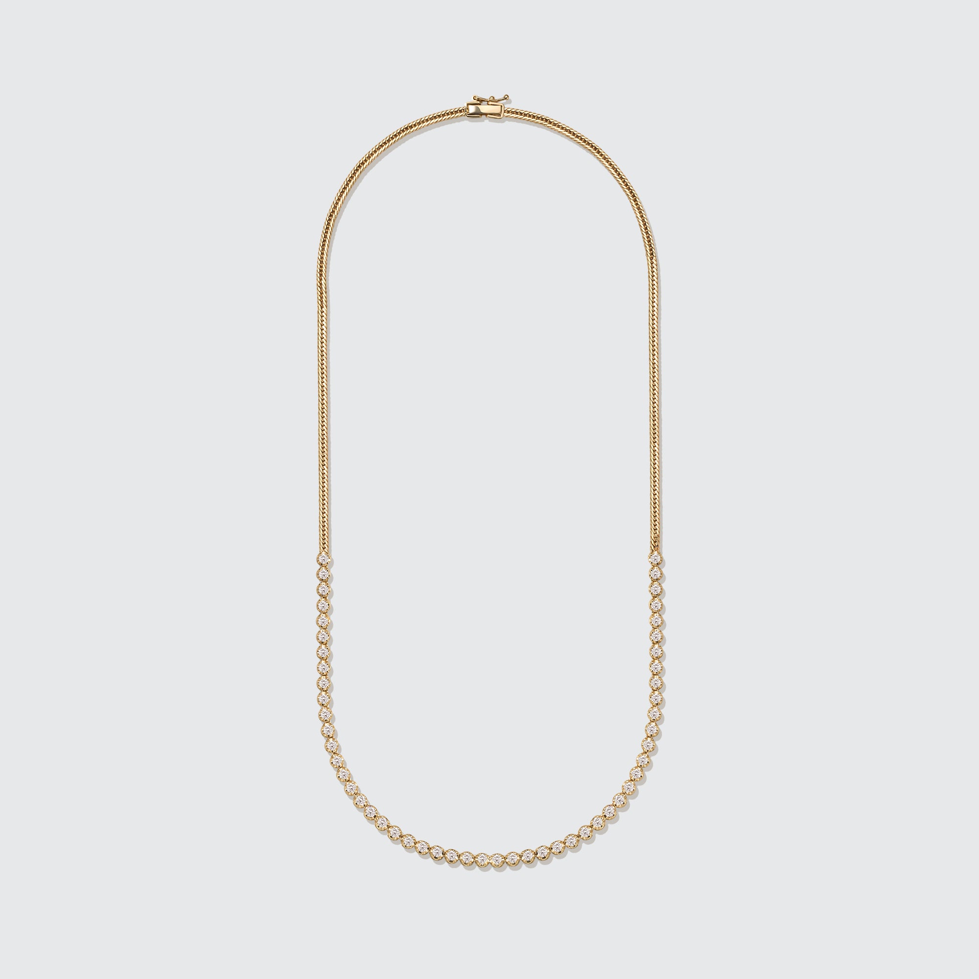This 18K yellow gold necklace features a brilliant-cut diamond tennis front that connects to a wheat chain for a refined, comfortable drape. Secured with a box clasp, it delivers statement sparkle without feeling heavy.