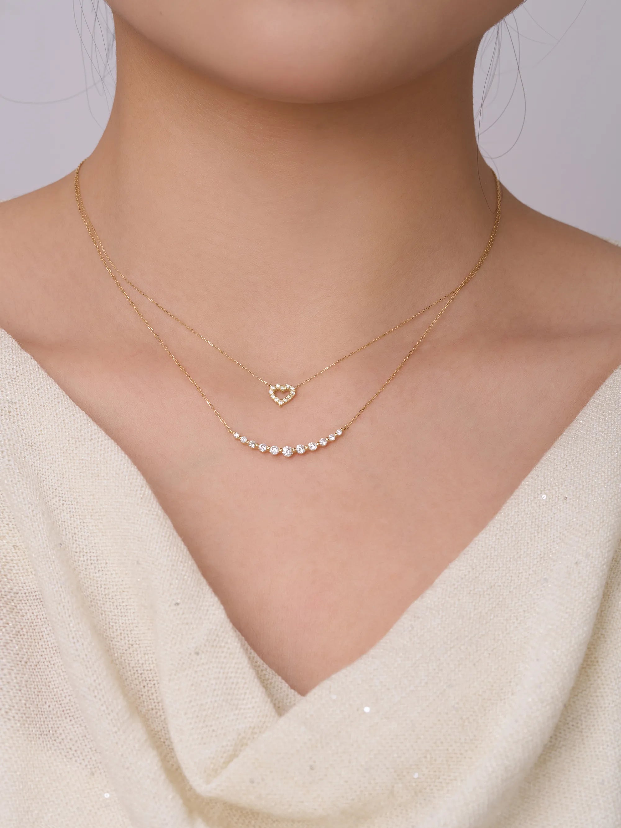 An elegant 18K gold necklace featuring a refined row of graduated bezel-set round diamonds at the center. The diamonds are arranged with a slightly larger center stone, tapering gracefully to smaller stones on each side for a balanced, luminous curve along the neckline. Suspended from a delicate gold chain and finished with a classic spring ring clasp, this timeless design offers subtle brilliance perfect for everyday wear, layering, or effortless sophistication.