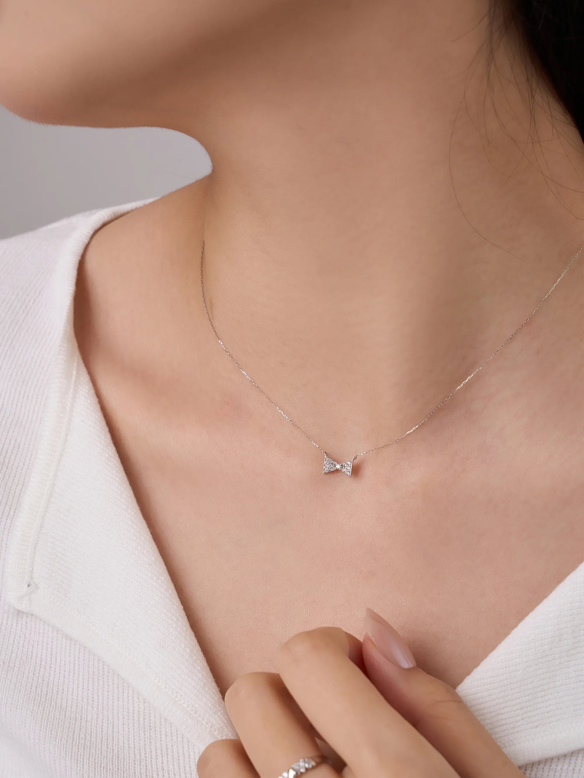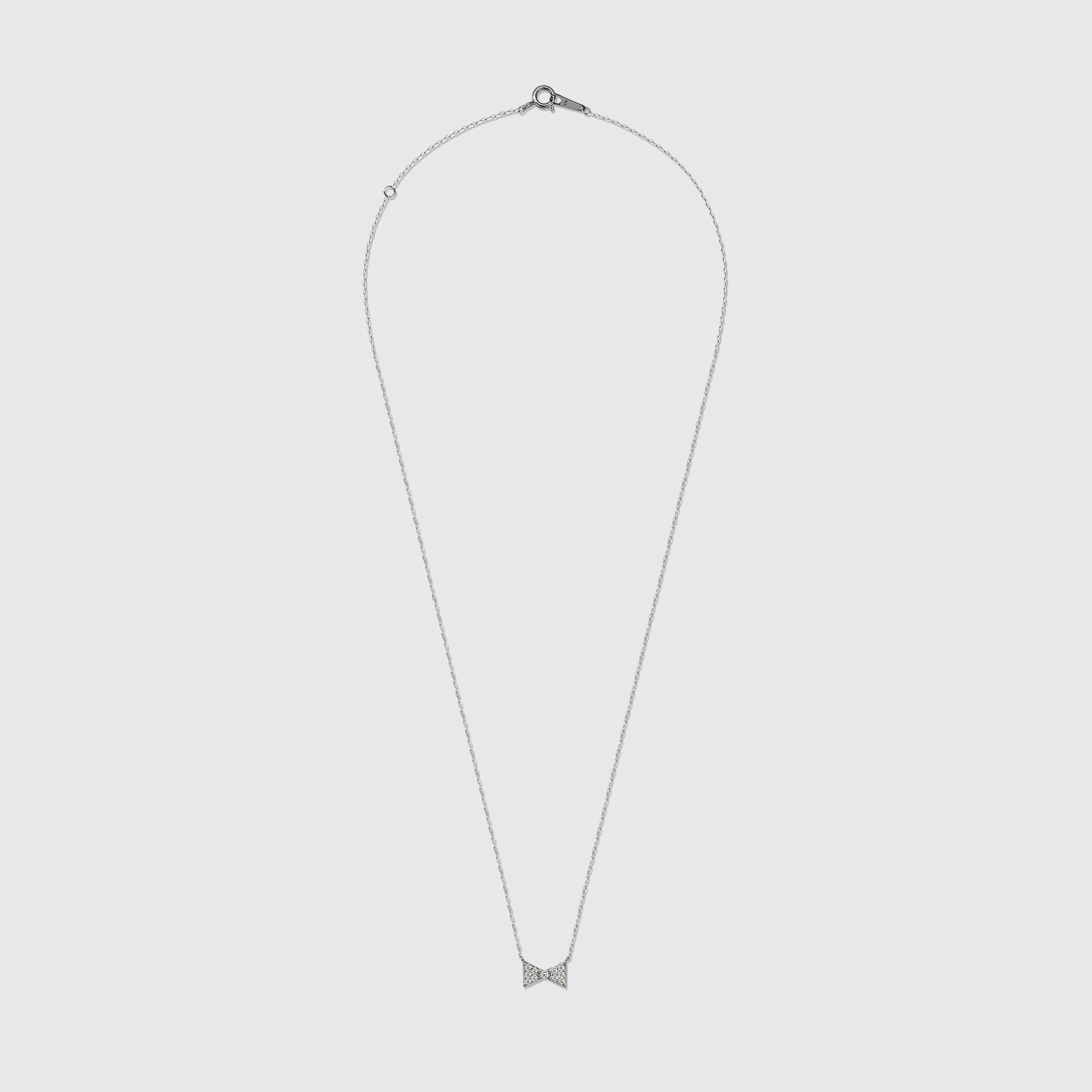 Cast in luminous platinum, this dainty necklace features a charming bow pendant encrusted with sparkling pavé diamonds for a refined take on the coquette aesthetic. The fine cable chain includes a convenient 3cm extender, ensuring a perfectly adjustable fit that sits beautifully on the collarbone.