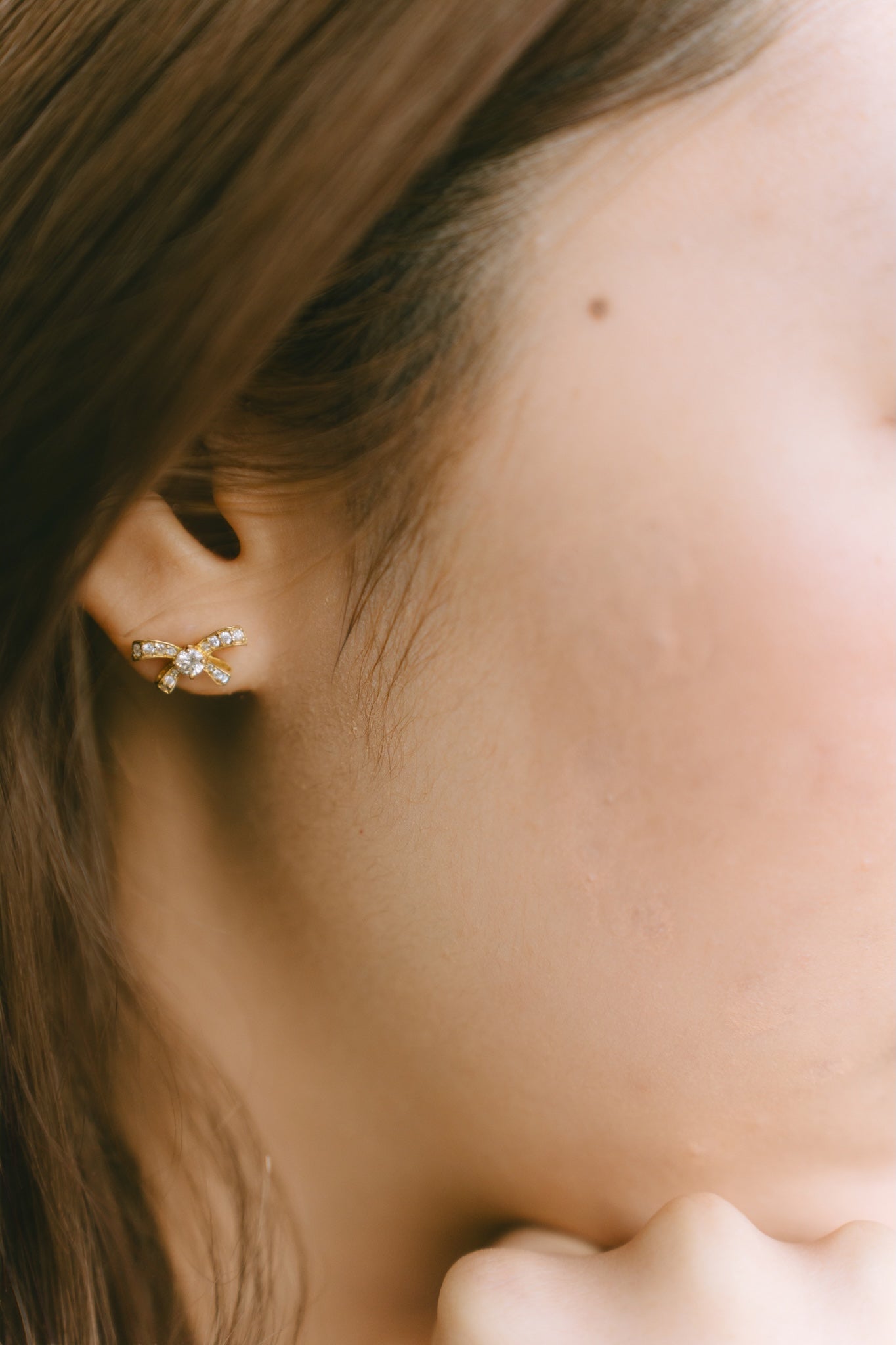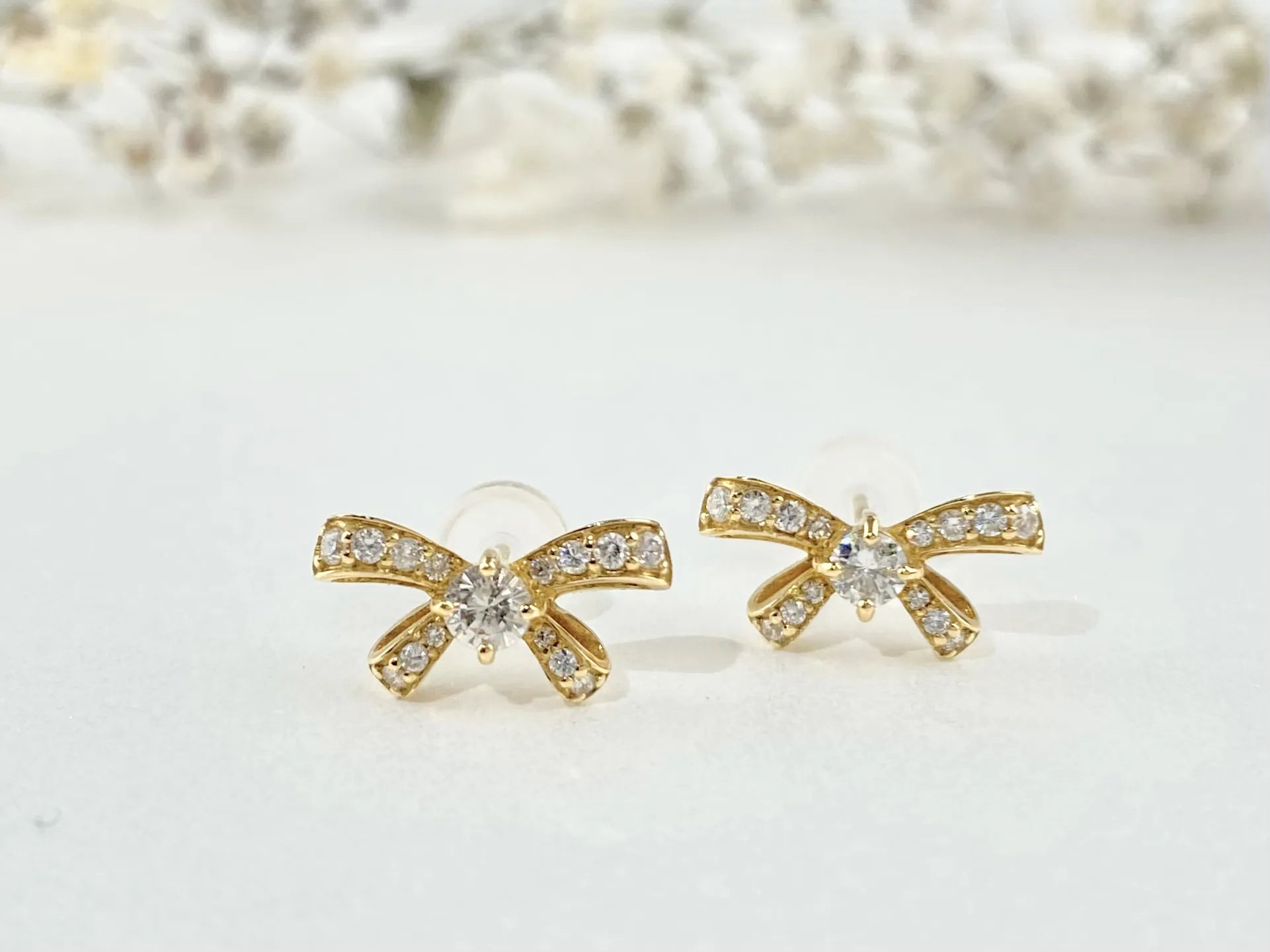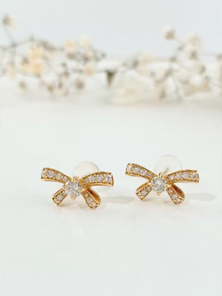 These bow-shaped stud earrings feature a polished gold finish and pavé-set sparkle that catches the light with every turn. Perfect for minimalist stacks, second piercings, and gift-giving when you want something small that still feels special.