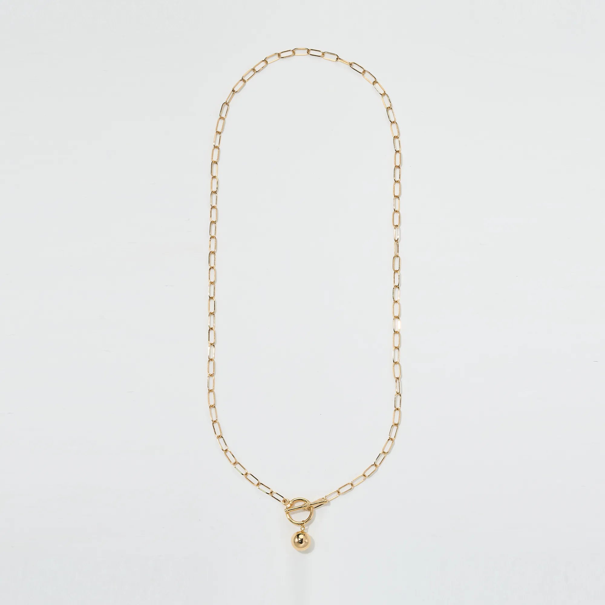 Crafted in 18K yellow gold, this paperclip chain necklace finishes with a toggle stacker clasp and a polished ball charm for clean, modern shine. Wear it multiple ways—solo, reversed, or layered—and add your favorite charms or pendants to build a personalized stack. An easy “goes-with-everything” piece that elevates tees, knits, slip dresses, and blazers alike.
