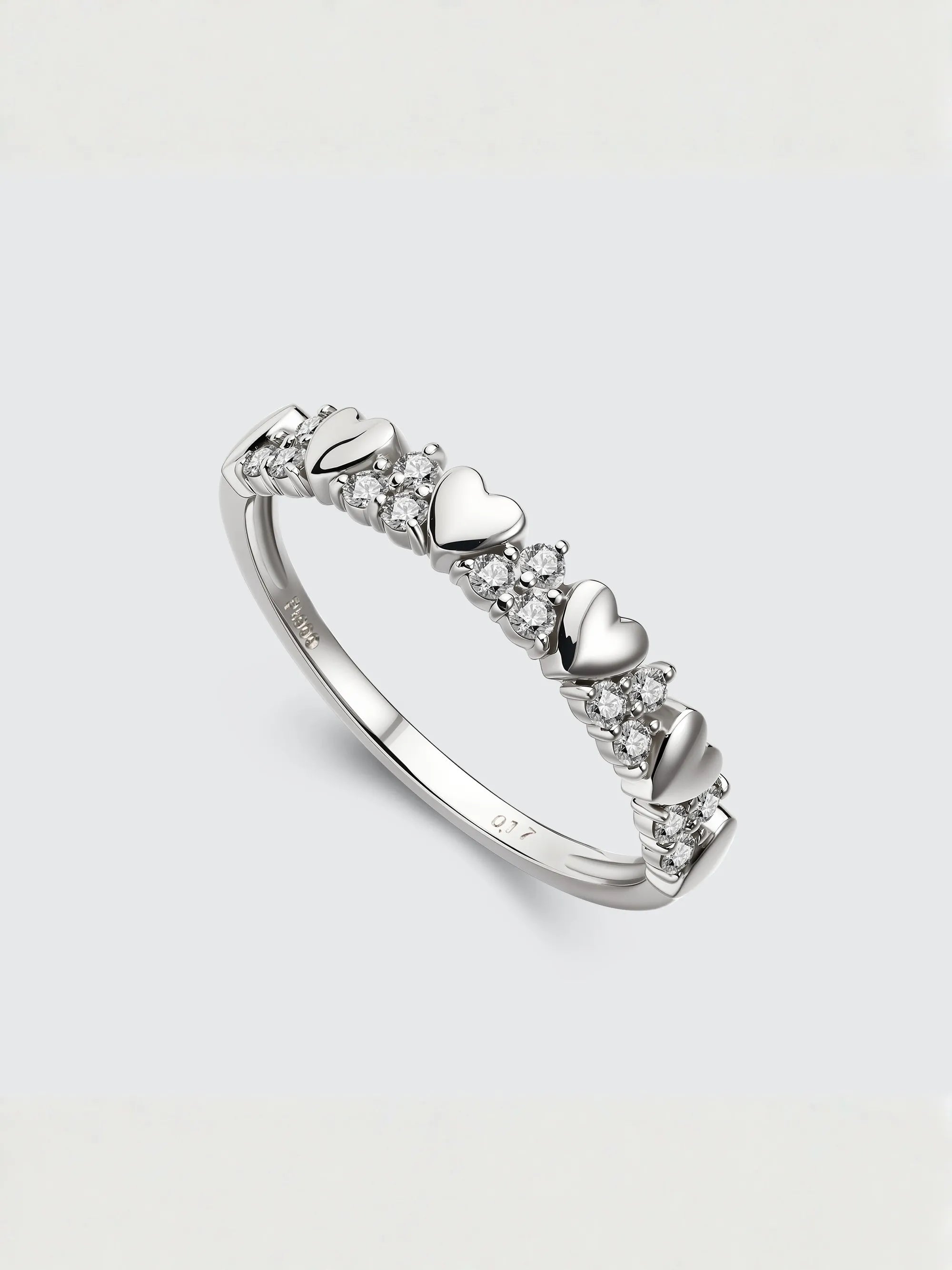 This polished platinum stacking ring features a sweet row of high-shine heart motifs accented with sparkling round diamonds for a modern, romantic look. A timeless choice for anyone searching for a platinum diamond heart ring that’s durable, refined, and effortlessly giftable.