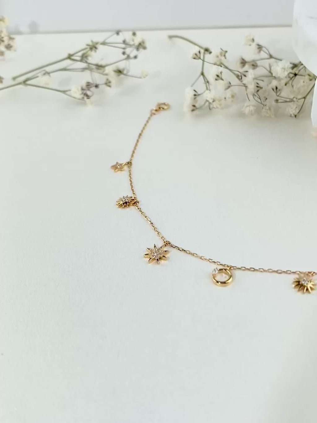 A celestial-inspired 18K gold bracelet adorned with sparkling diamonds set in delicate sun, moon, and star motifs. The brilliant diamonds capture the beauty of the night sky, symbolizing light, dreams, and eternity. This bracelet combines elegance and cosmic charm — perfect for both daily wear and special occasions.